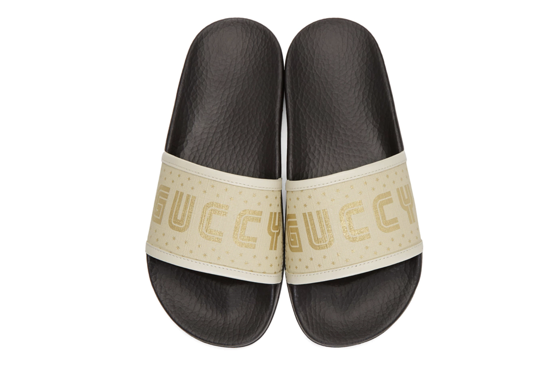 Ever sine creative director Alessandro Michele has taken the reins, the house of Gucci has taken measures to connect with youth culture and play around with its image as a luxury brand. The new “Guccy” logo first appeared in the 2018 Cruise Show in an apparent attempt to poke fun at the brand’s history of counterfeit and fakes. The design of the logo itself is an homage to video gaming culture, bearing a striking resemblance to the SEGA logo. It’s safe to say that these slides were created with the intent of getting you from your front door to the nearest pool.