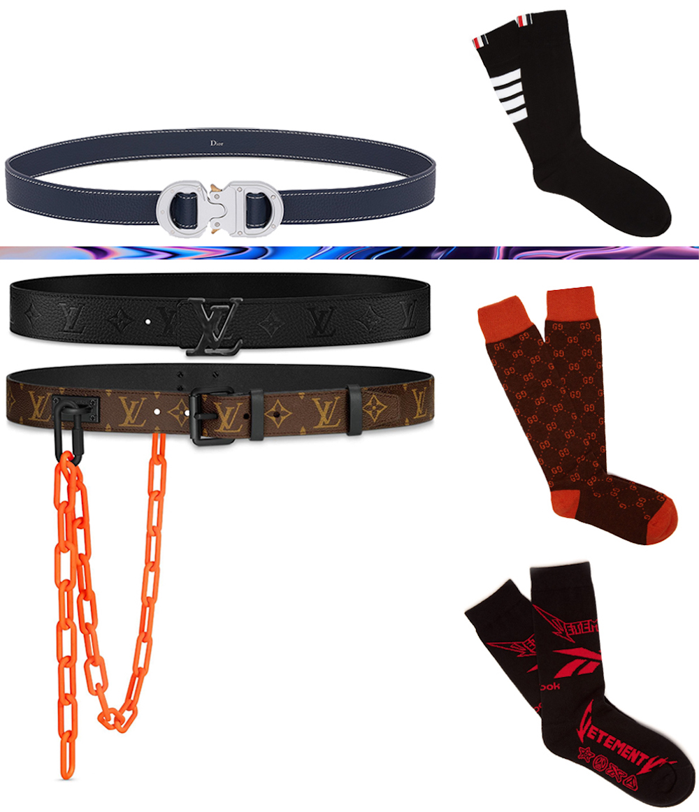 Don’t sleep on the details, a belt and a good pair of socks are just as important as the rest. Kim Jones’ new Dior Homme has been heavily anticipated this season, and so are their new belts with hardware designed by Matthew Williams of 1017 ALX 9SM, Alyx Studios. Louis Vuitton has also gotten a streetwear update within their accessory lines, with an all black leather monogram belt and canvas rendition with matte chain detailing. Socks are more about personal preference, so I have a Thom Browne pair for the preppy boys, Gucci for the fashion sisters, and Vetements for the hypebeasts.