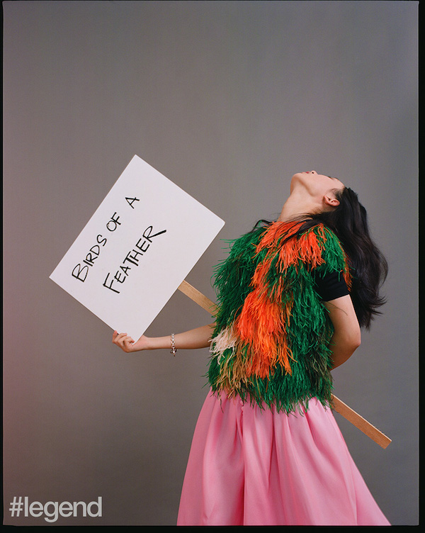 Green and orange feather top _ Loewe, Pink organza skirt _ Marc Jacobs, silver bracelet _ Celine