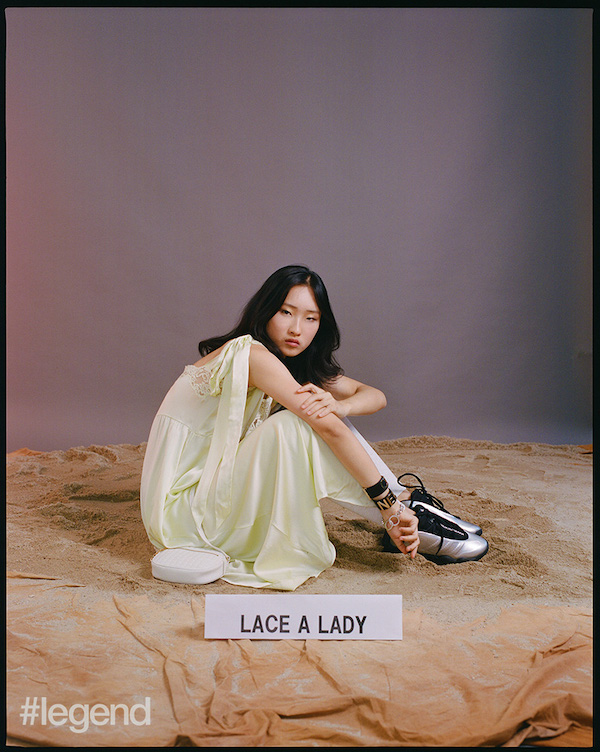 Pale yellow lace dress _ Stella McCartney, Silver sneakers _ Adidas x Alexander Wang, Leather cuffs _ Chanel, Silver bracelet _ Celine