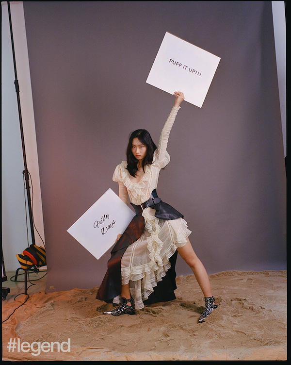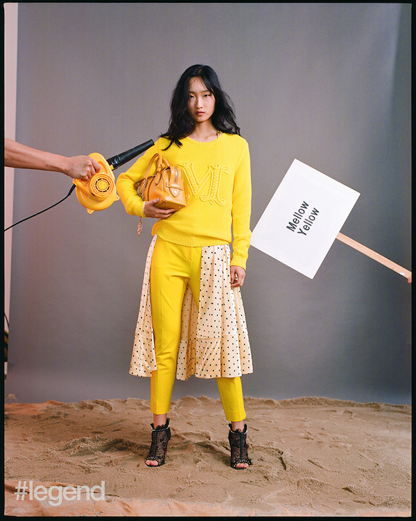 Yellow sweater and trousers _ Max Mara, Yellow bag _ Tod’s, polkadot dress _ Stine Goya from Net-A-Porter, lace studded booties _ Christian Louboutin