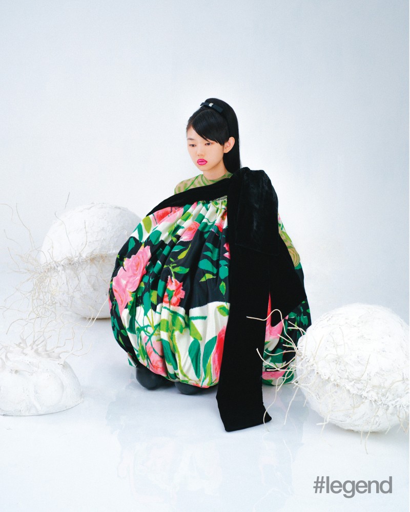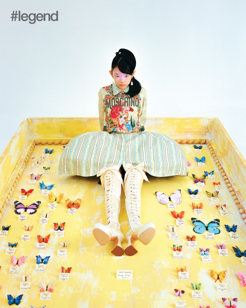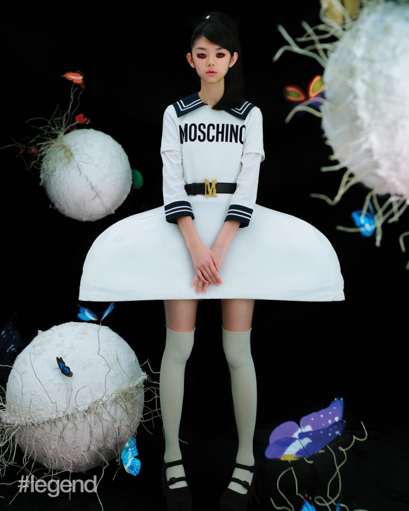 Floral-print dress and black latex leggings by Richard Quinn at Joyce; Black headpiece by Gucci White and navy sailor-collar shirt by Miu Miu; White dress and black and gold belt by Moschino; Black double-strap shoes by Simone Rocha; Black headpiece by Gucci