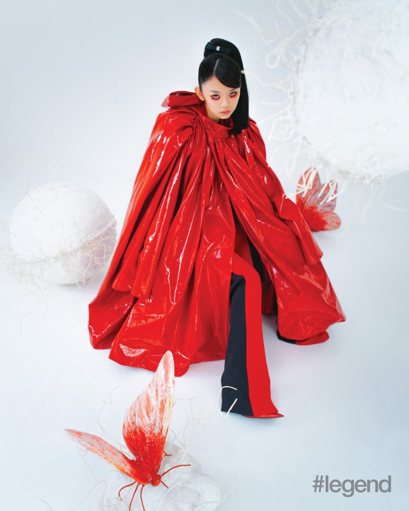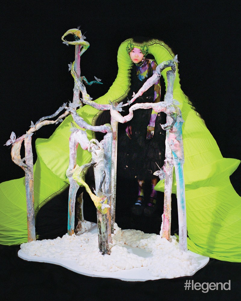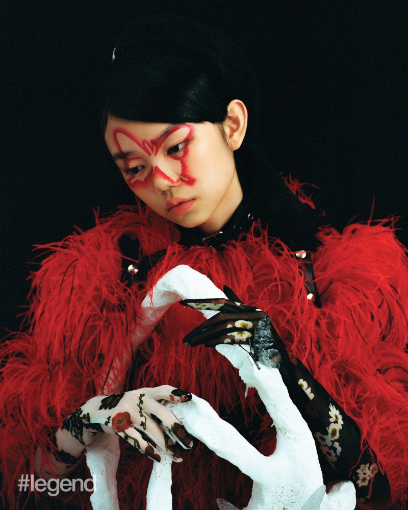 Black bodysuit by Miu Miu; Multicolour mesh corset by Windowsen; Black headpiece by Gucci; Green beaded earrings by Shuting Qiu Red feathered dress by Givenchy; Black harness and headpiece by Gucci; Floral-print sheer gloves by Shuting Qiu