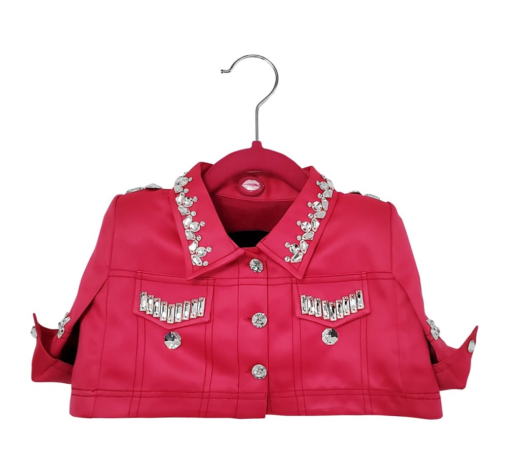 Created in a heavyweight luxurious Italian satin, the neon pink Club Lover creates a dramatic statement by day or night. The contemporary jean jacket design gives the jacket a festive street style vibe. Club Love, part of a very limited edition collection, is also embellished with custom-cut Swarovski crystals making it perfect for daytime drama and opulent theatre nights.