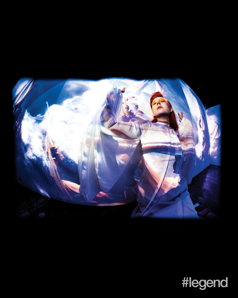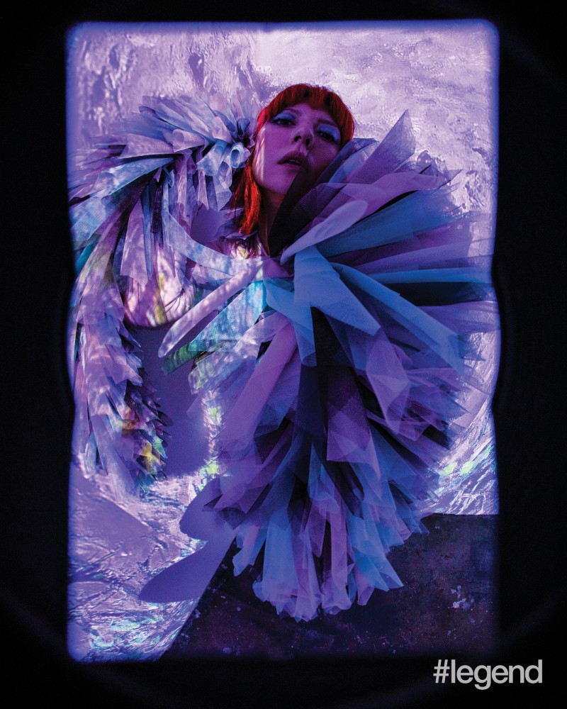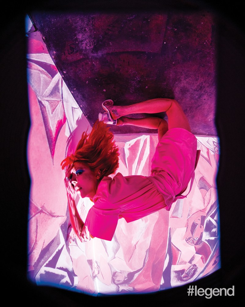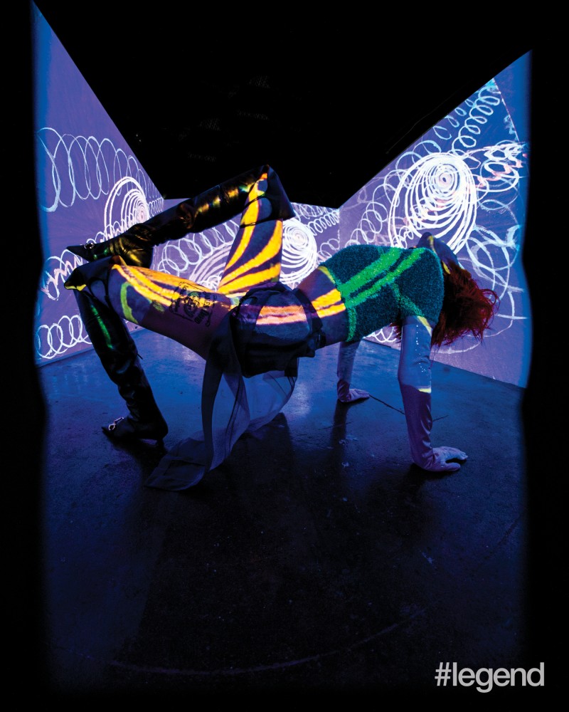 Model in Gucci green knitted top, purple chiffon dress, black thigh-high boots and cream patent gloves Hilma af Klint, Primordial Chaos No. 16, 1906–1907 Model in Marni white deconstructed jacket and matching skirt Pablo Picasso, Figure at the Seaside, 1931