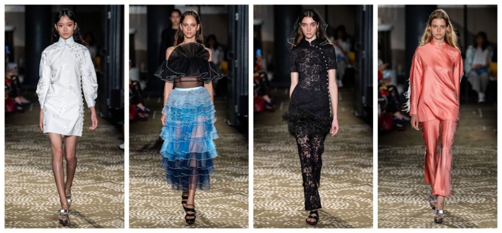 The tired cliché of “East meets West” truly can only be done justice by Huishan Zhang, who proves that his capabilities have no end. Inspired by the “infectious appeal” of the ’60s, we were presented with a different side of this decade – think less Twiggy in retro mini-dresses and more Mrs Chan from In the Mood for Love. Known for his more outlandish and borderline debutante looks, Zhang looked to his home country (and home market) for a little more finesse, as he is quickly becoming the go-to for the upper echelons of Chinese society. The flamboyancy of his chosen decade was reflected in the use of plumage and vivid colourways of salmon pink and electric blue. Opening with a pristine over-the-knee shift cheongsam, he echoed his first V&A collection piece from 2012. Traditional frogging finished with pearls, floral jacquards and delineations of marabou fringe (a staple in this Chinese designer’s repertoire) brushed past on silky pyjama sets and lacey two-pieces. As Zhang never disappoints, extravagance and drama weren’t spared as airy, effortless layers of ruffles paraded past guests. A self-claimed romantic, it was only fitting that models had veils to parallel the romanticism and the emotion of this collection. “Cheongsam will always be guiding my strong and confident women through time, as it did in the movies,” he says, but it seems Zhang himself is guiding our female protagonist.