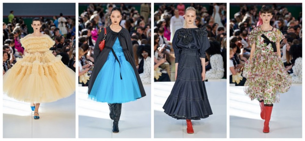 Molly Goddard’s heroine is more Villanelle than damsel in distress this season. With her design immortalised by Killing Eve, it’s difficult to avoid or deny her influence on the high street this past season. The voluminous yet effortlessly airy tulle gowns billowed and breezed down the runway, literally filling it as they brushed past front-row audience members’ knees. Her streamlined wisdom was served in slimmer styles and garnished with trimmings of denim and taffeta skirts. Although ambitious in volume, none were sur le dessus. Unlike her peers who chose themes and modernised the past, Goddard’s individuality and genius shone through her honing of her technical know-how. She aimed to inflate her iconic silhouettes to a larger magnitude without the overcomplications that underpinned them (and we don’t mean this figuratively). Reigning supreme were the propagations of tulle and pouf skirts – if you closed your eyes and heard the rustle alone, you could probably tell it was Molly Goddard. The floral prints added an element of whimsy and jocularity; however, none were more whimsical or jocular than the loofah-like lemonade dream of a gown. A celebration of talent, Molly Goddard’s SS20 collection made clear that she’s only just started.