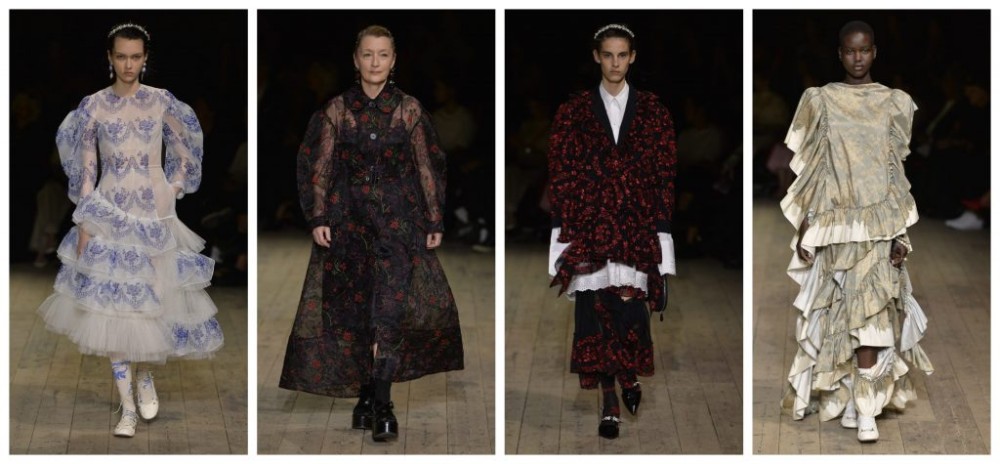 Simone Rocha found solace in her referential collection stemming from the “Wren Boys” of her homeland, Ireland. “Punkish boys who go knocking on doors… so I wanted to bring a masculinity to the table” – and she quite literally meant table, as she derived inspiration from the tablecloths, china and wallpaper of the homes on whose doors were being knocked. We may not be particularly well-versed in the history of folklore or the Celts, but we know how to appreciate art – and art this was. An enchantingly mesmerising collection of delicate ruffles of cobalt and white opened the show – idyllic scenes of countryside tea parties with starched tablecloths, grandma doilies and windows frosted with netting were materialised. We transitioned into a sweet sugar almond-pink set, before taking a darker turn into the more punk-like manifestation of the Wren Boys. Our fairy-tale rurality is disturbed by a harsher, possibly more macabre undertone with the introduction of black ruffles and red sequins – we were bewitched. The pre-Christian tradition was further appreciated through the straw-trimmed outfits, much akin to the ones worn to capture a wren. No details were overlooked in this meticulous medley, with wrens painted on the foreheads of models and ballooning silhouettes mimicking “the outline of the bird”. With such an appreciation for cultural importance, intertwined with the power of women, Simone Rocha captivated us.