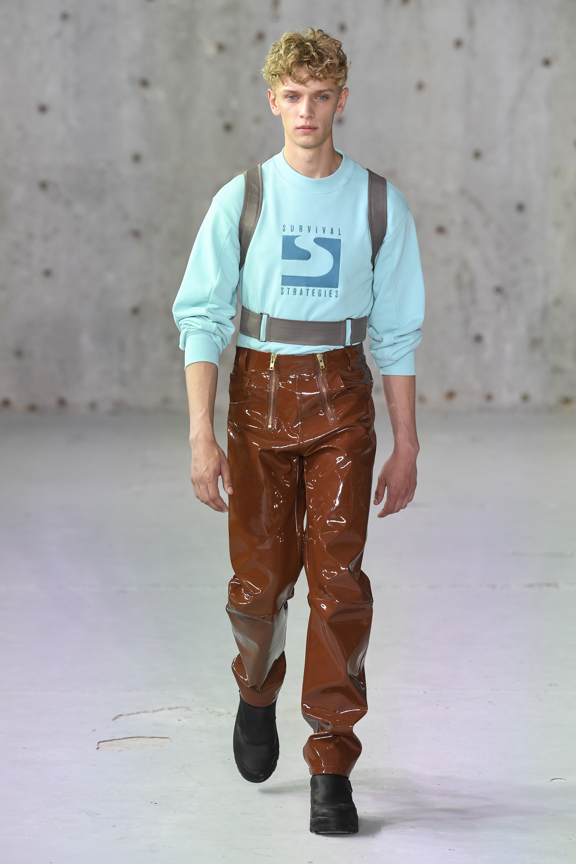 A newer label to the shows, GmBH is run by duo Benjamin Alexander Huseby and Serhat Isik. Thheir show titled “Survival Strategies” was inspired by the duo’s need for survival due to the challenges they face being from mixed ethnic backgrounds in Europe. The collection was experimental yet utilitarian, with slick PVC workwear pants serving as a recurrent motif in the entire collection.