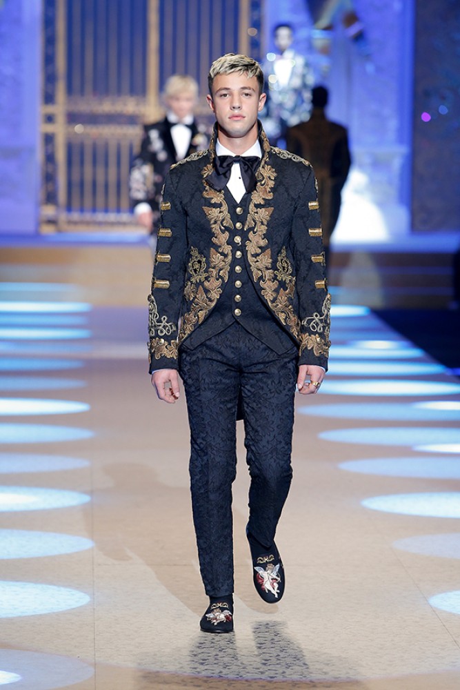 Millennials took over the runway (yet again) for Dolce & Gabbana during Milan Men’s Fashion Week Fall/Winter 2018/19. The show opened with Christian Combs (P Diddy’s 19-year-old son) in an exquisitely tailored gold-brocade tailcoat and matching suede loafers.