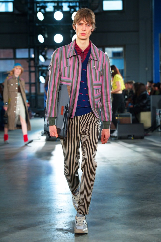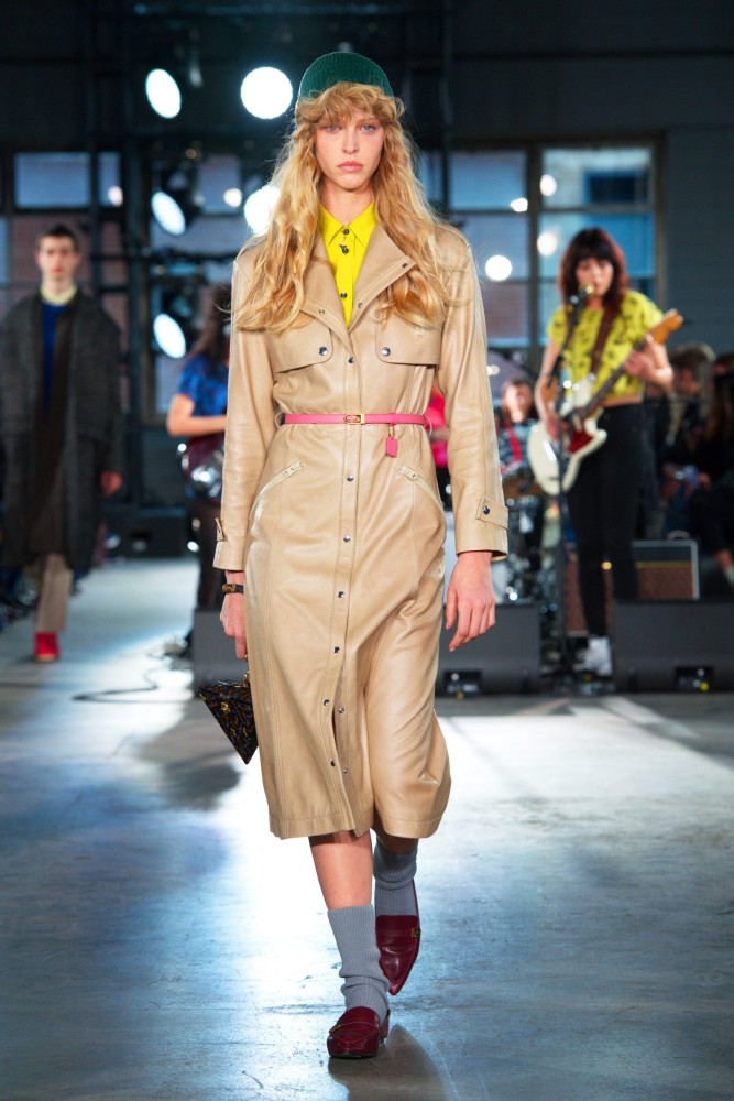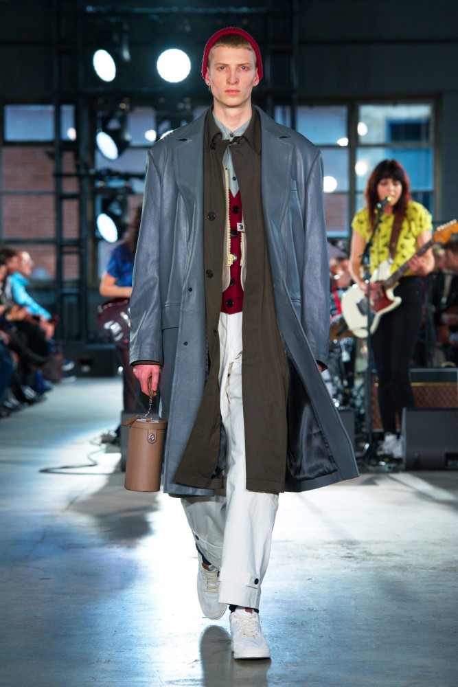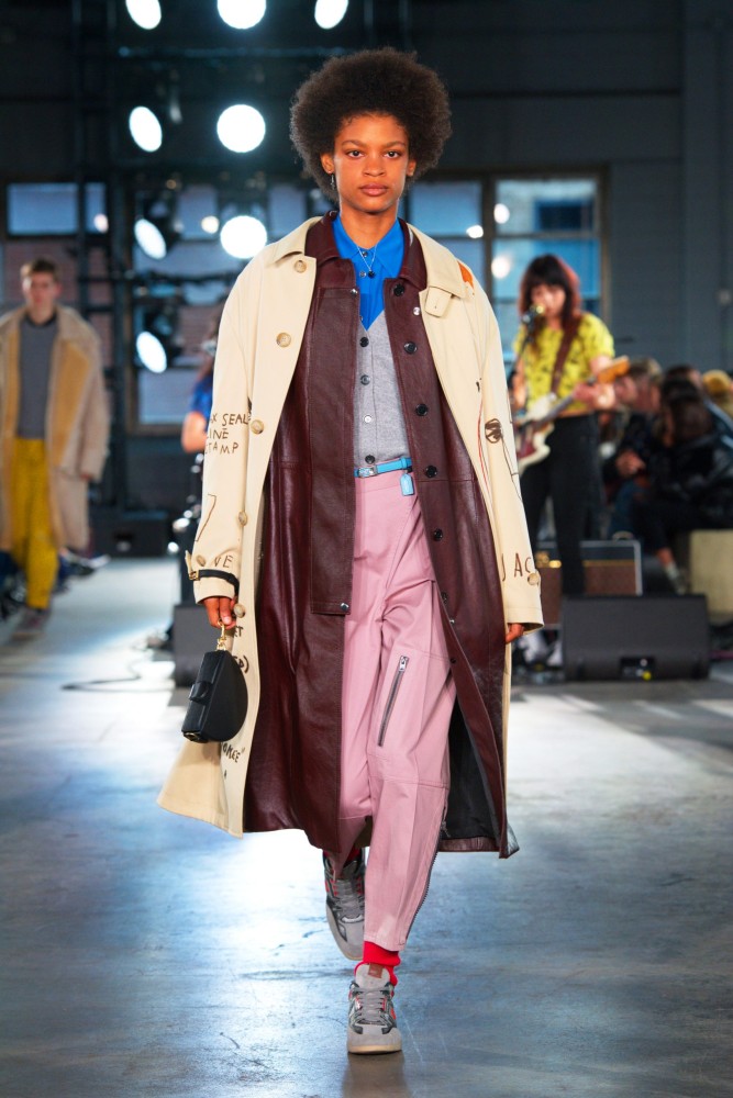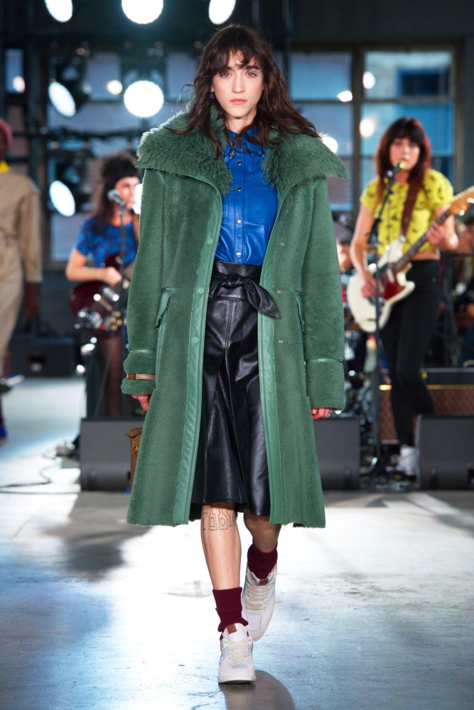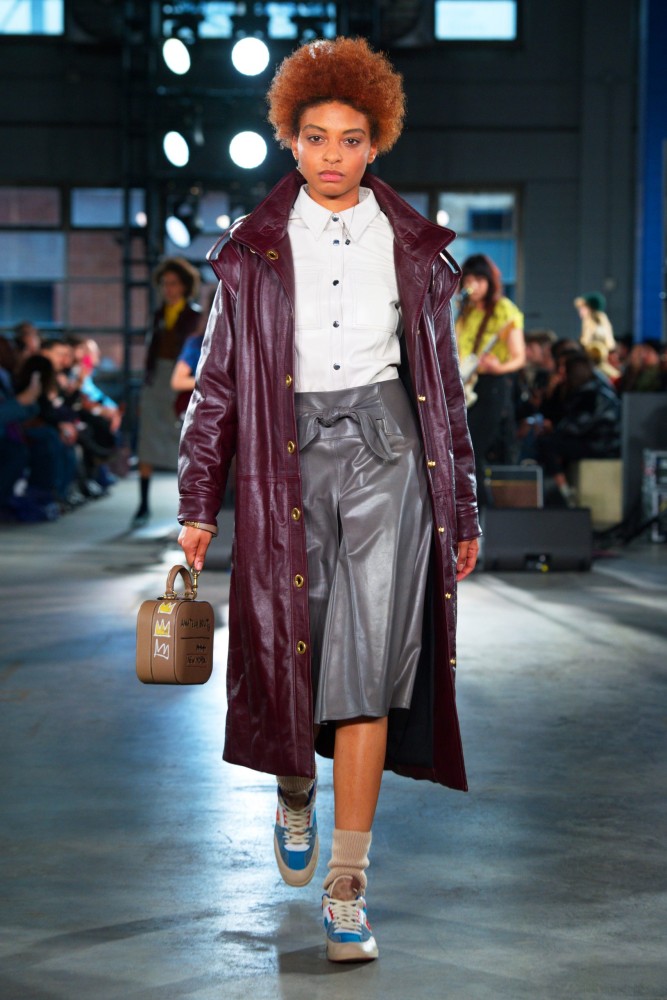 A continuation of the saga of last season’s 1980s New York nostalgia, Coach brought a more defined and streamlined interpretation of the decade. Last season featured T-shirts and Richard Bernstein tanks, but this season brought the distillation of an icon: Jean-Michel Basquiat. The artist’s legacy was interlaced throughout, embodied in a graphic palette reminiscent of his art as well as his unmistakable uniform of blanket scarves, oversized leather trenches and box bags. With almost-triangular silhouettes and wide shoulders tapering towards the body, the coats were boxy in a masculine display of downtown arrogance. The double-layered trenches and Crombie coats drifted past, styled with sneakers and slouchy sock-loafer combinations. Creative director Stuart Vevers collaborated with members of the Basquiat family, who sat in the audience. The artist’s niece, Jessica Kelly, made her model debut and there was a Debbie Harry cameo – fitting, as she made an appearance in the film Downtown 81, starring Basquiat. Harry closed the show with a performance of Blondie’s “Dreaming”, but this time her infamous bag was carried by Kelly.