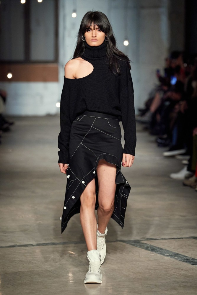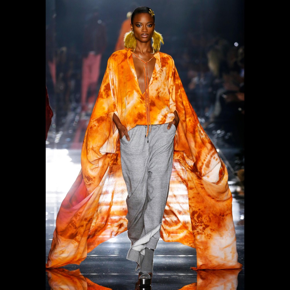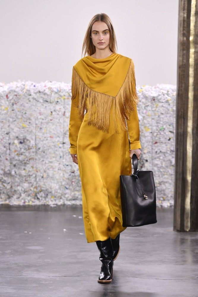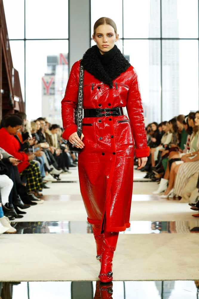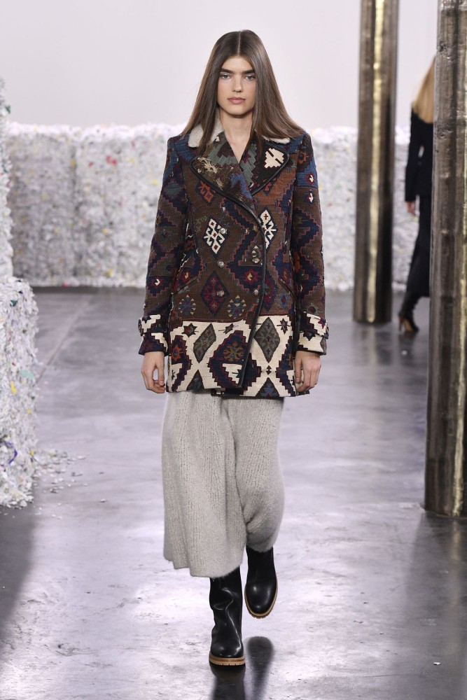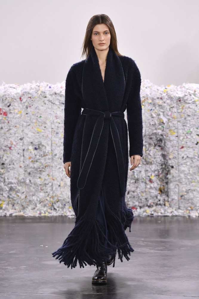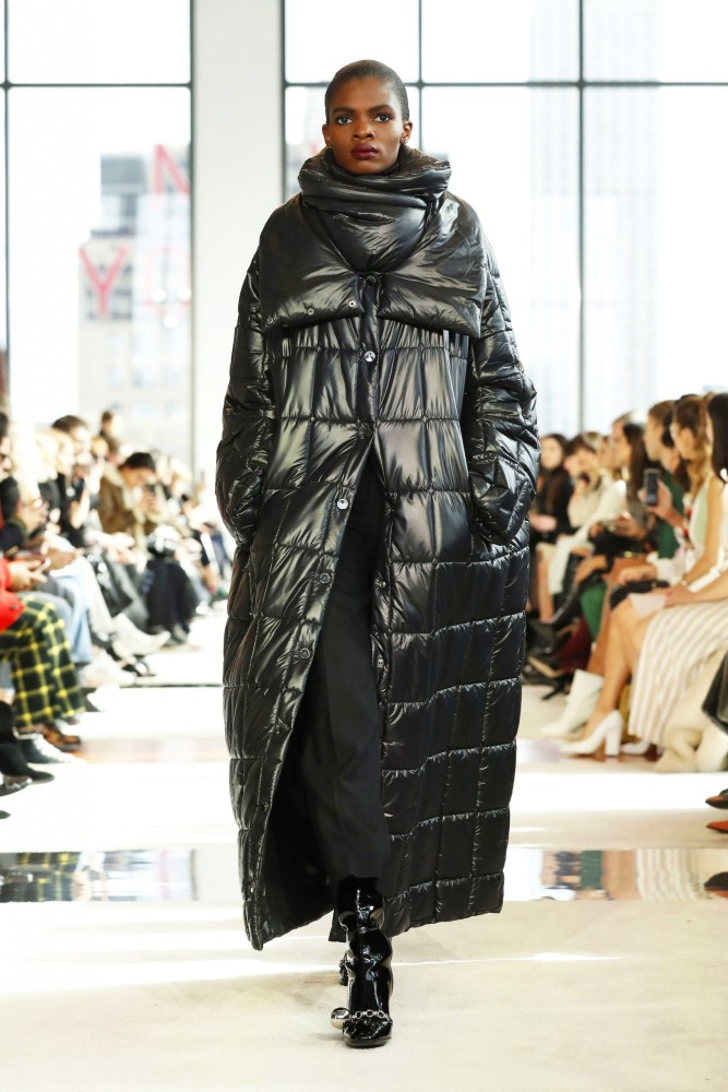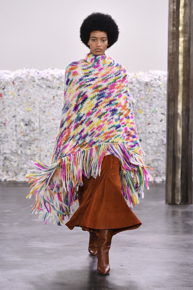 Using a backdrop of bales of shredded paper from Brooklyn, Gabriela Hearst posed a question about the future of fashion and the wastefulness of it all: Can we turn waste into fashion and/or art? For her first carbon-neutral fashion show, Hearst remained true to the luxury aesthetic of her brand, but with a more conscious outlook. Flirting between an artisanal hippie and a Manhattan Upper-Eastsider, she certainly outdid herself. An array of repurposed, deconstructed and reconstructed apparel including Turkish kilims, trench coats, peacoats and bags all made a statement. In homage to her native Uruguay, Hearst displayed the Manos del Uruguay collective’s hand-knit scarves, which used even more recycled cashmere yarn than previous collections. In a sharp contrast to the comforts of home, the suits this season gravitated towards a ’70s sharpness, but with a cashmere corduroy coaxing. The colour transition was indicative of the changing of the day: warm mustards flowed into a riff of Joseph’s Amazing Technicolor Dreamcoat before moving to a palette of neutrals, blacks and whites. The Matrix-esque leather glistened and flowed, exuding pure opulence.