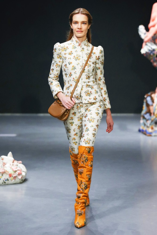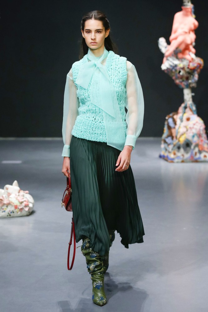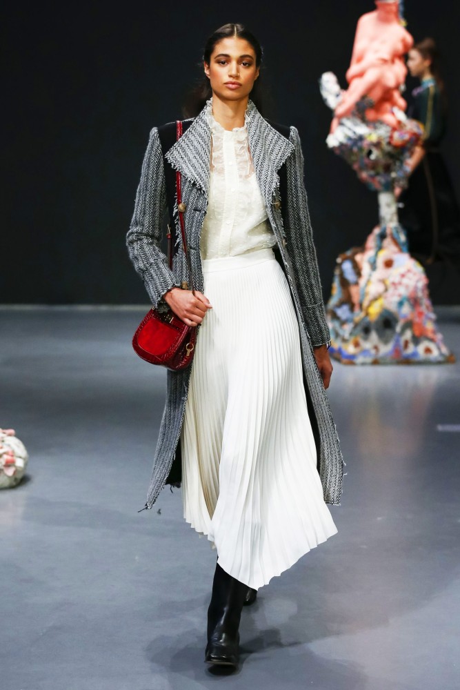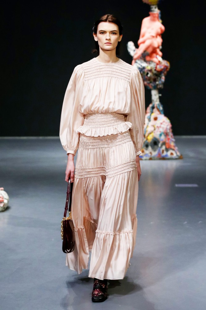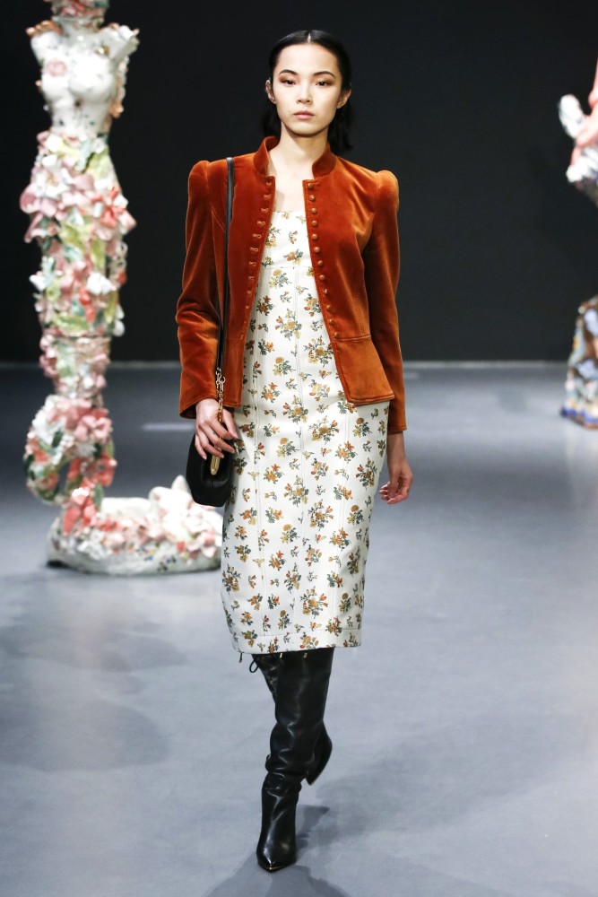 This season, Tory Burch collaborated with New York sculptor Francesca DiMattio to create a show for the empowered woman. (In 2012, Burch bought DiMattio’s first ceramic sculpture, so this show was a reconnection.) The artist designed the floral prints, in addition to the sculptures of female figures fused with fertile flora dotted around the Sotheby’s catwalk. The subtle, subversive aspect of her art was mirrored in the clothes that ensued, which questioned what it means to be feminine, and how the objectification and apotheosis of the female form has been skewed to make way for unconscious bias. Ice-cream-toned pastels, floral prints, basket weaves, wedding beads and ankle-grazing skirts served as the basis. What it means to be a powerful woman was altered, as there were no minimal, sharp-edged suits, but rather mandarin-collar Edwardian jackets with embroidered over-the-knee boots. Tradition was revisited with smocking, jacquard, delicate porcelain florals and riding trousers. The collection exuded a sense of serenity and calmness, which is a much needed breath of fresh air in this day and age.