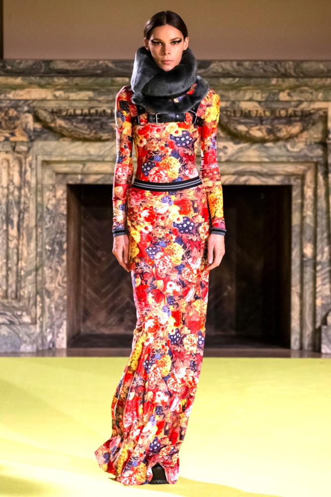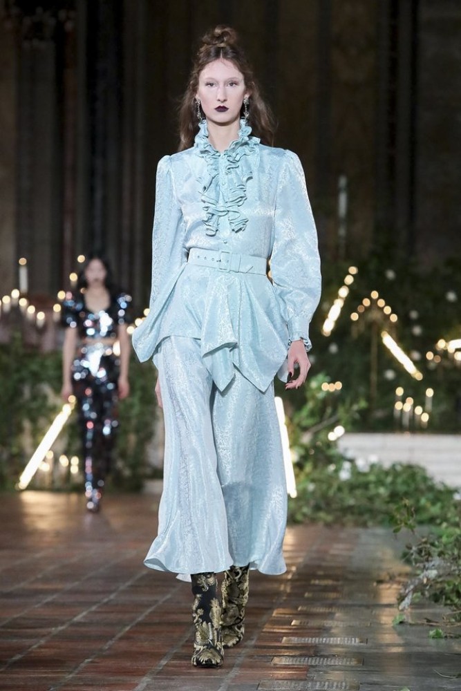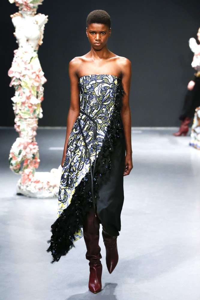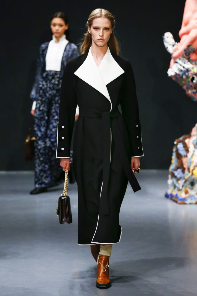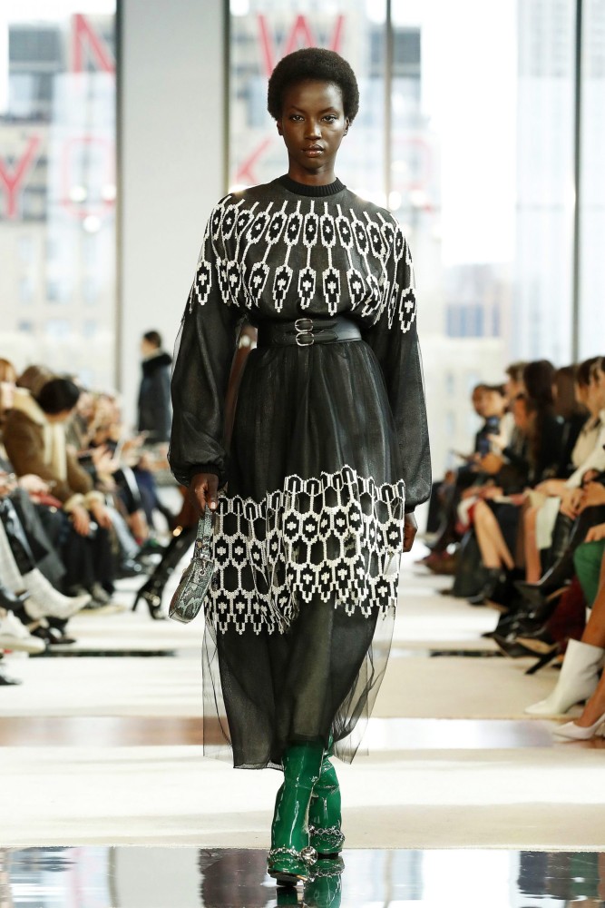 This season, Tory Burch collaborated with New York sculptor Francesca DiMattio to create a show for the empowered woman. (In 2012, Burch bought DiMattio’s first ceramic sculpture, so this show was a reconnection.) The artist designed the floral prints, in addition to the sculptures of female figures fused with fertile flora dotted around the Sotheby’s catwalk. The subtle, subversive aspect of her art was mirrored in the clothes that ensued, which questioned what it means to be feminine, and how the objectification and apotheosis of the female form has been skewed to make way for unconscious bias. Ice-cream-toned pastels, floral prints, basket weaves, wedding beads and ankle-grazing skirts served as the basis. What it means to be a powerful woman was altered, as there were no minimal, sharp-edged suits, but rather mandarin-collar Edwardian jackets with embroidered over-the-knee boots. Tradition was revisited with smocking, jacquard, delicate porcelain florals and riding trousers. The collection exuded a sense of serenity and calmness, which is a much needed breath of fresh air in this day and age.
