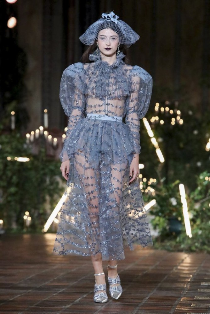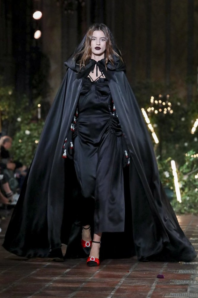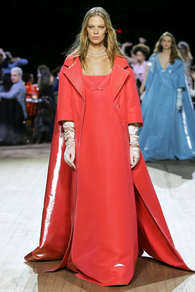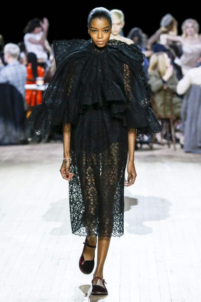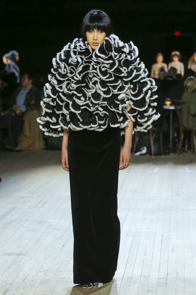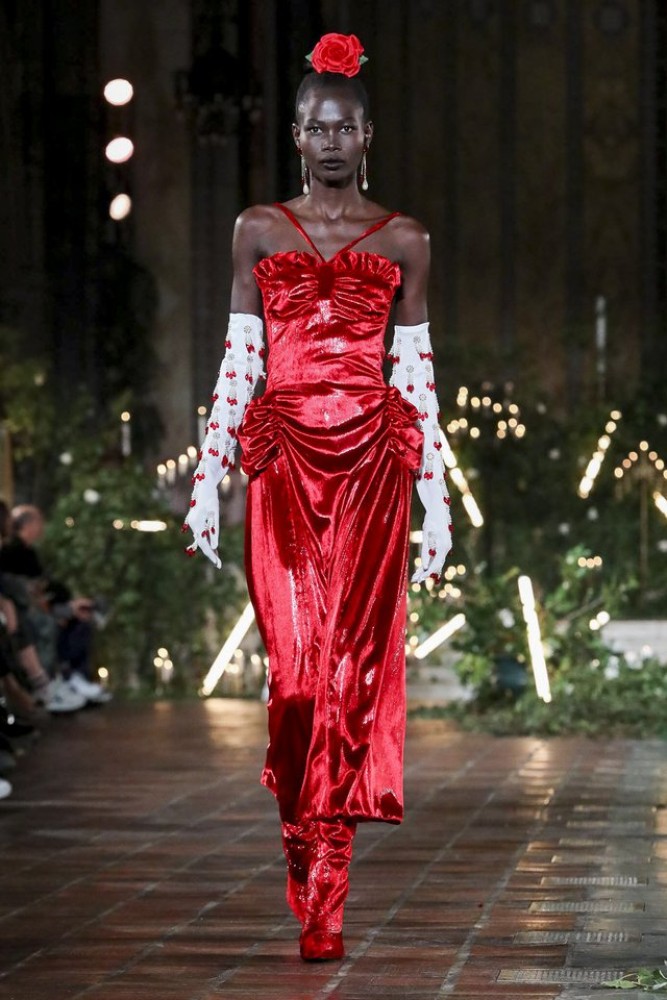 By candlelight in St Bart’s Church, Rodarte brought a gothic touch to the Byzantine Revival via a dark romance brimming with sensuality and understated lust. Referencing the 1992 Francis Ford Coppola film adaptation of Bram Stoker’s 1897 novel Dracula, the Mulleavy sisters made our tragic heroine the protagonist for this collection. Dimly lit and ethereal, the show opened with a red and white polka-dot dress that appeared more Pretty Woman than Mina Harker – but the day dresses melted into a more macabre and risqué tulle-and-sequin-embellished dream before slipping into a tropical, almost sickly series of looks. An oversized collar dress adorned with floral appliqué, tinted green by the delicate embroidery, floated down the runway in a glimpse of spring – an ironic juxtaposition against the dark lips and spider earrings. It wouldn’t be a proper vampiric collection without a cascading satin hooded cape, fit with a corseted and draped satin dress to match, complete with white and red beading inside, truly befitting the Count’s lover. A standout was a sheer bespangled nude dress with a boa made of orchids in every shade of purple imaginable. Welcome the new femme fatale.