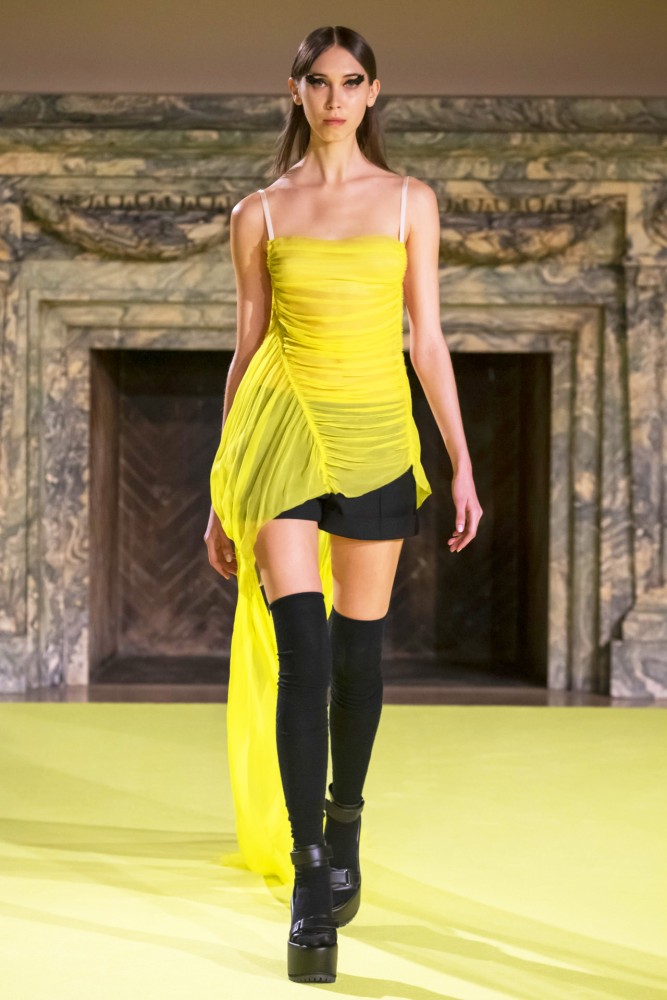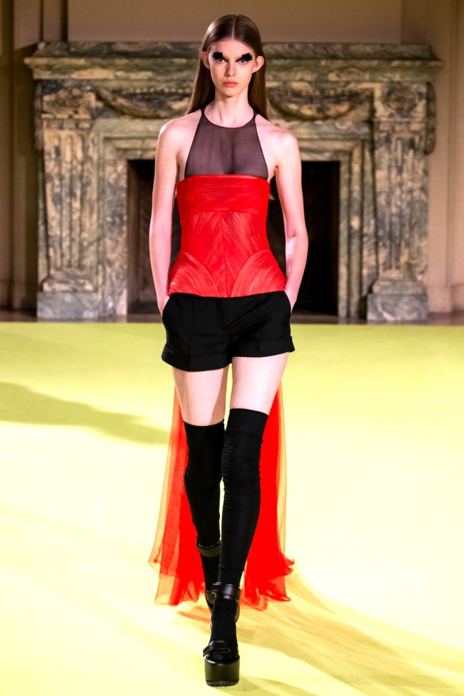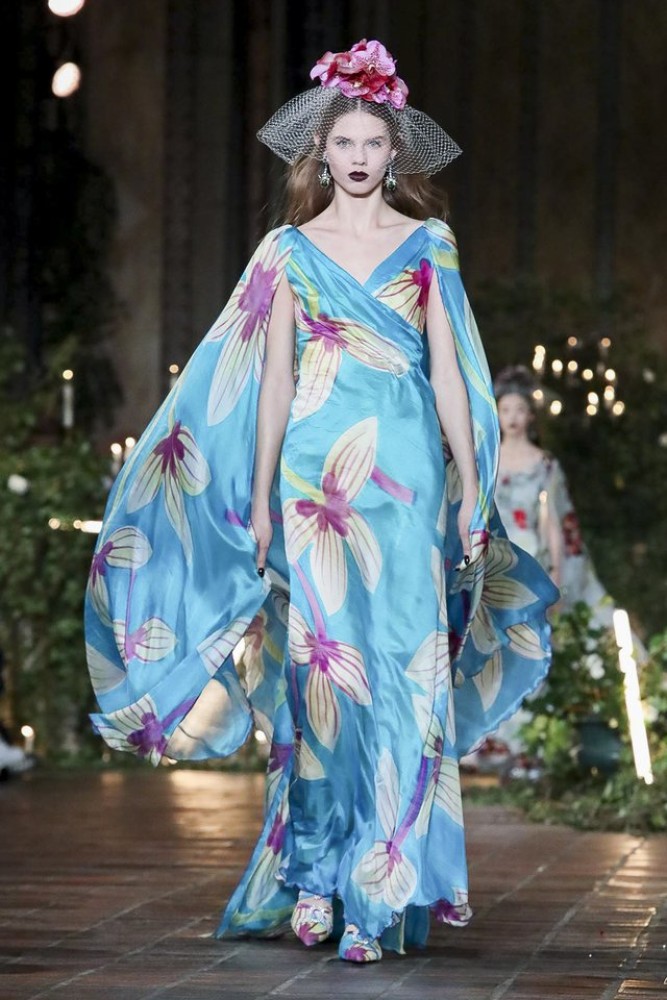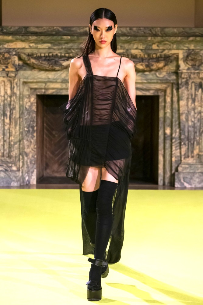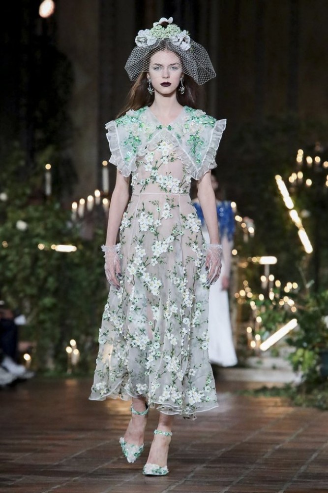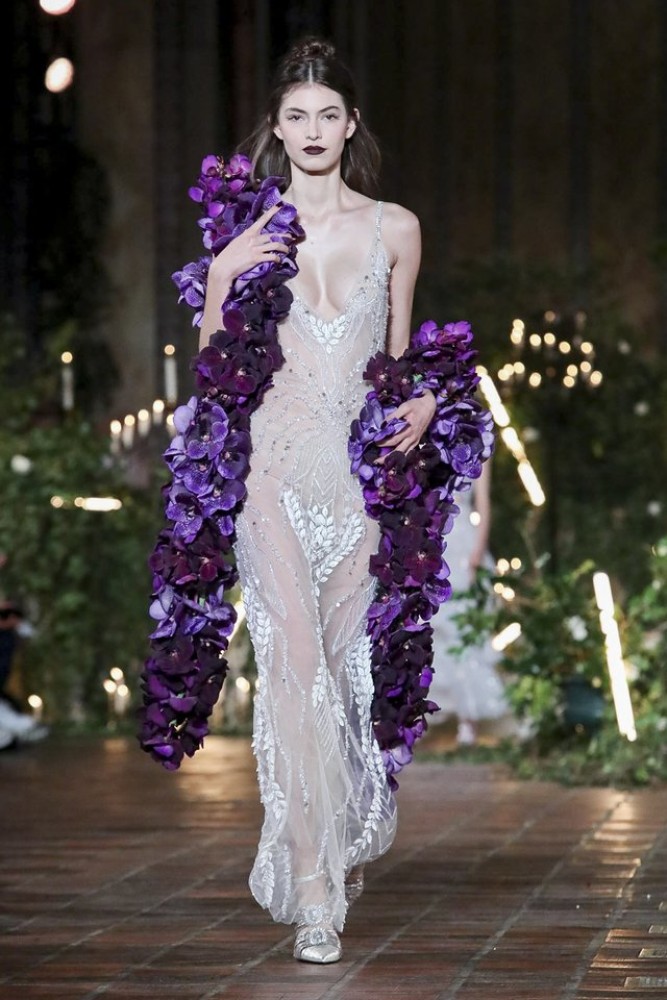 By candlelight in St Bart’s Church, Rodarte brought a gothic touch to the Byzantine Revival via a dark romance brimming with sensuality and understated lust. Referencing the 1992 Francis Ford Coppola film adaptation of Bram Stoker’s 1897 novel Dracula, the Mulleavy sisters made our tragic heroine the protagonist for this collection. Dimly lit and ethereal, the show opened with a red and white polka-dot dress that appeared more Pretty Woman than Mina Harker – but the day dresses melted into a more macabre and risqué tulle-and-sequin-embellished dream before slipping into a tropical, almost sickly series of looks. An oversized collar dress adorned with floral appliqué, tinted green by the delicate embroidery, floated down the runway in a glimpse of spring – an ironic juxtaposition against the dark lips and spider earrings. It wouldn’t be a proper vampiric collection without a cascading satin hooded cape, fit with a corseted and draped satin dress to match, complete with white and red beading inside, truly befitting the Count’s lover. A standout was a sheer bespangled nude dress with a boa made of orchids in every shade of purple imaginable. Welcome the new femme fatale.