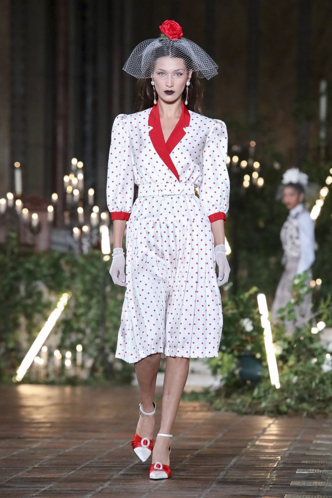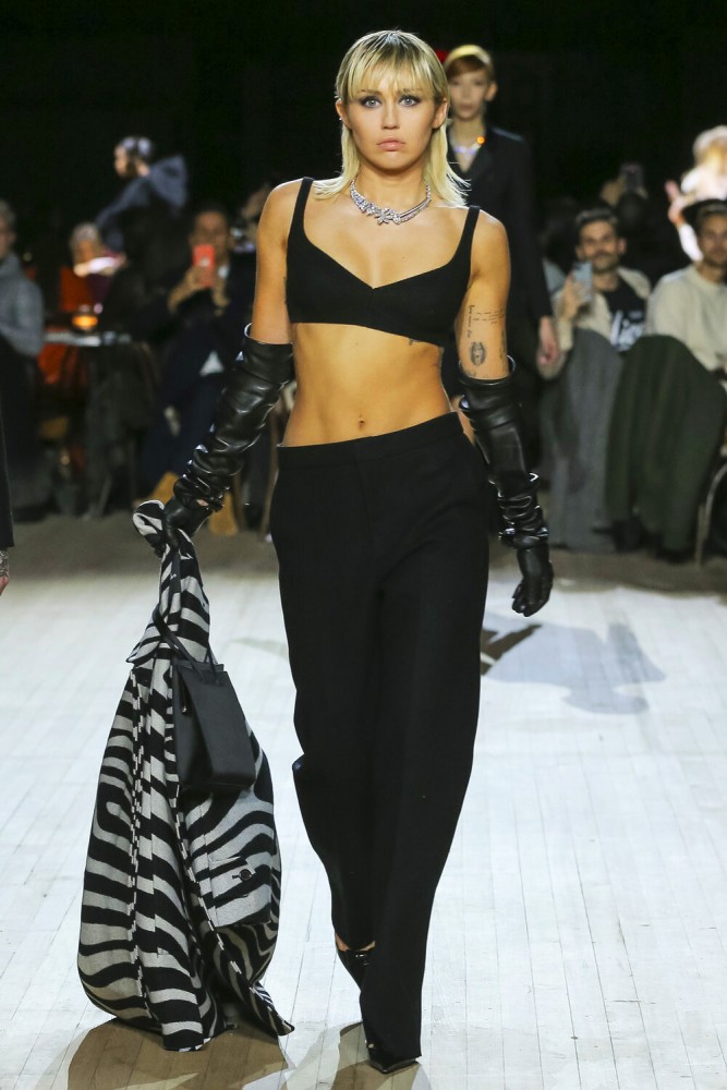 With an acute foresight into cultural phenomena, Jacobs has an innate ability to revive a past trend and somehow make it better. The “punk ballerina” of the ’80s, Karole Armitage, opened things with an electrifying performance before disappearing into the darkness. The show was bedlam in the best way possible: a bazaar of idiosyncratic technicolour and mid-century sentimentality. In a complete divergence from last season’s extravagant hyperbole, this season sought solace in a Marvelous Mrs Maisel meets Mad Men rendezvous that was a little more restrained and poised. Kaia Gerber’s lemon posset dream of an outfit screamed Manhattan socialite, as did Bella Hadid’s sequinned gown with full arm-length white gloves. Sugary pastels and icy metallics were sprinkled in amongst the rosette dresses, veiled hats and Peter Pan collars. Miley Cyrus even appeared in a black bra and trouser combo, dragging a zebra print coat alongside her. The finale looks were pure joy: a sheer black lace dress with a gigantic bow (as though this show wasn’t already a present in itself already) and a watermelon column dress and coat ensemble that gleamed as it passed by. Forget the Roaring Twenties; bring back the ’60s!