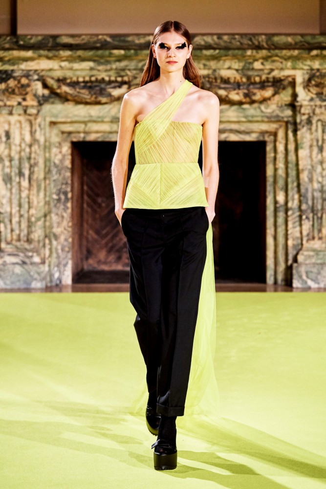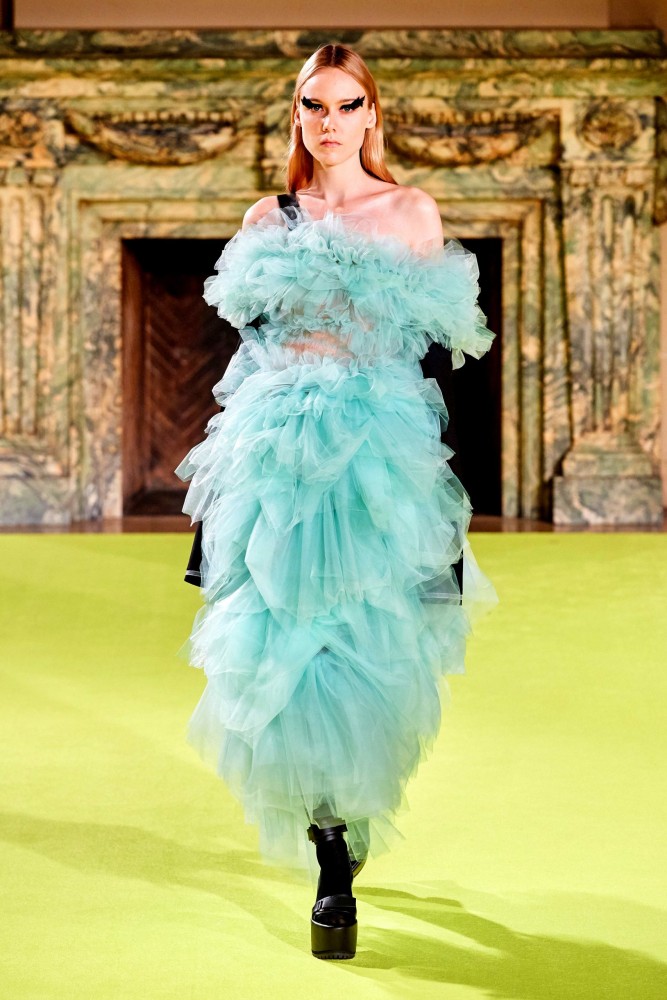 The year 2020 has brought a lot of new beginnings and Vera Wang reminded us that the new decade was an occasion to be celebrated – with print and colour. The boyish gothic style persisted, while the traditional pickings of towering platforms and lingerie-inspired pieces were pursued. Asymmetric hemlines, whimsical youthful shorts and perfectly tailored trousers were given a facelift – one that didn’t come in the shape of fillers or Snapchat-filter-like nonsense, but through injection of colour. On offer were graphic photoprint floral crewnecks under cascading mesh slips, neon-green tulle corsets, and an almost-kitsch patterned maxi dress finished with sport-stripe detailing at the cuffs and waist under a black leather bondage harness and a cosy fur scarf. It was quite the spectacle. The show ended with tulle dresses reaching loofah-like volumes in lavender, chiffon lemon and seafoam, all kitted with harness strappings. The sweet and innocent were combined with the robust and less dainty side of things. In the past, Vera Wang may have been the reason why black was the only colour needed in your wardrobe, but this season, she’s showing us it’s time to change.