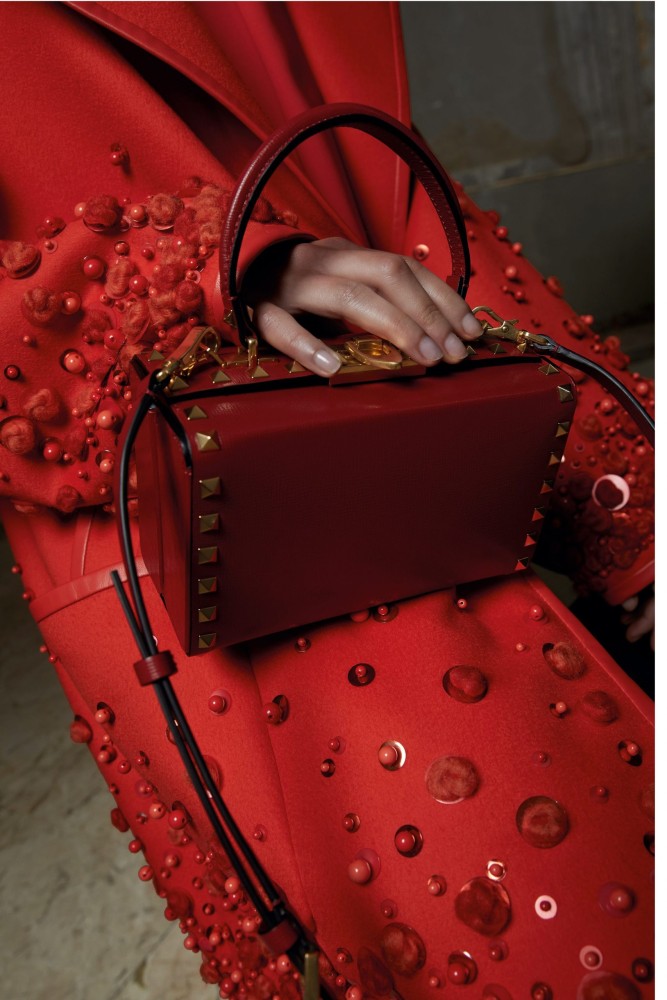 Valentino’s mastery tales series celebrating the timeless excellence and extraordinary savoir faire of the maison continues with Chapter 5, dedicated to the Valentino Garavani Rockstud Alcove box bag. First introduced in the Valentino Roman Palazzo Autumn 2021 collection, the petite bag with a big punk attitude comes in three hues of crossed grained leather –classic black, iconic red and a daring animalier print style –as well as an edgy all-over studs version. The iconic Rockstud fliplock closure is on the top of the bag while the antique brass studs define the outlines and leather strap.
