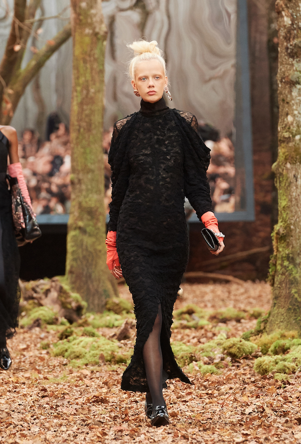 Shown in a forest, the Chanel collection proved to be the most effortless it has ever been. Long fluid lengths that goes nicely with Chanel’s tradition of the tweed. There will be no complaints of more tweed with these modern looks. Silhouettes were slim with sporty jackets or classic jackets made dresses with plays on proportions. There was a gasp in the audience when the metallic over the knee boots in flat heel height presented themselves and danced their way through the rest of the show. Also interesting to note was the spot of evening black dresses that were feminine and timeless and just needing an occasion.