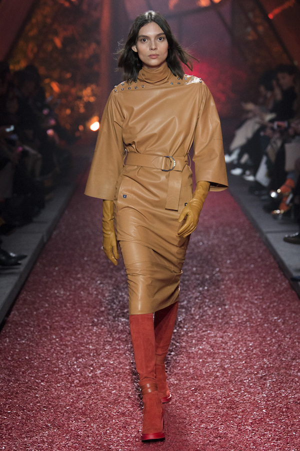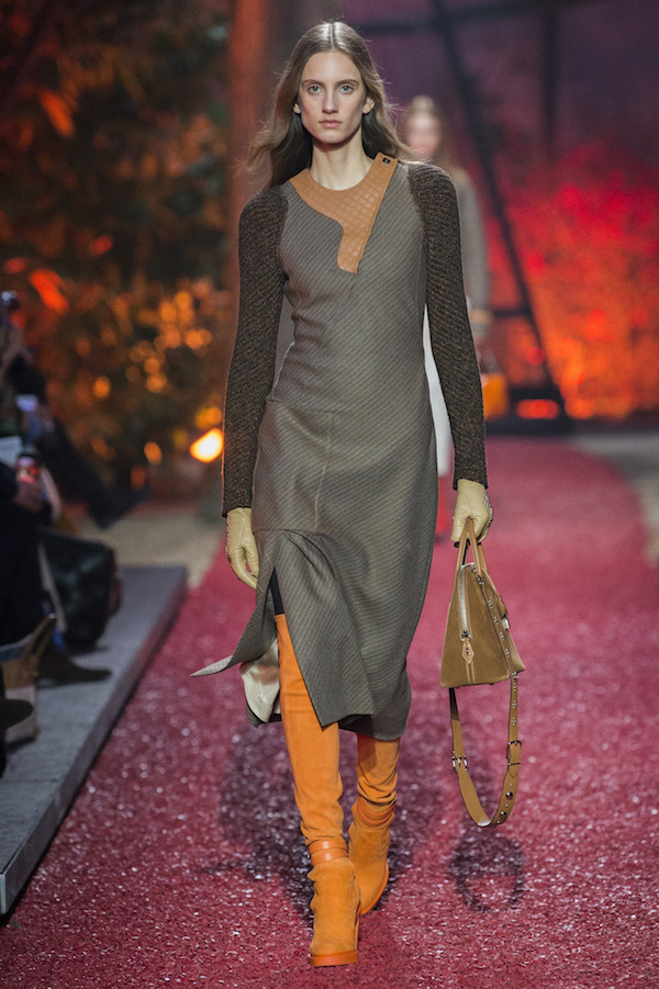 There is probably more accessories by the brand that are donned by most, but I think this collection will truly make everyone contemplate their ready to wear. Leather is a core part of the soul of the house, so to fashion these sleek midi dresses and slim knee length skirts made total sense. Black leather is definitely a trend this fall and it should come as no surprise that Hermes delivers some beautiful dresses and pants. Another note: the over the knee boots in rich bright color suedes such as red and orange.
