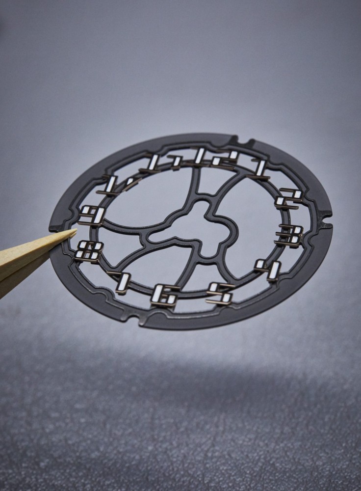 Moving to the exterior, it would be remiss of the RM 33-02 not to reference design characteristics of the brand’s quintessential tonneau shape. The case has incorporated the contours of the tonneau into its round shape and the eye is drawn to the carbon TPT bezel, which is accentuated by a satin-finished case band in red gold. The hypnotising battle between light and dark continues dial-side, with the 5N red gold hour markers positioned along two titanium rails fixed to the flange and movement, bringing a sense of dimension, uniformity and continuity, and further highlighting the round case shape. It’s worth noting that the grade-5 titanium spline screws used within the case and bridges offer greater torque control during the assembly stages and will age well. A black rubber strap brings a sense of increased informality to the piece and blends in seamlessly with the case.