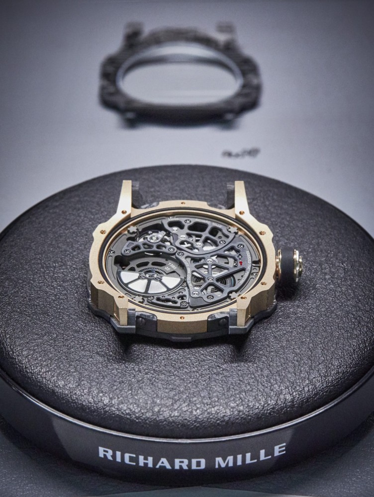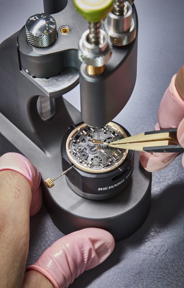The skeletonised RMXP1 calibre houses a 45-hour power reserve and is expertly crafted from grade-5 titanium, keeping a steady 3Hz thanks to its variable-inertia balance. The movement can by wound bi-directionally via an off-centre platinum micro-rotor that’s positioned rear-side to minimise the entire movement’s overall thickness. Despite its slim silhouette, the unique architecture and delicate finishing hasn’t been compromised in any way; the baseplate was tended to entirely by hand, initially wet-sandblasted and treated with Titalyt. Meanwhile, the microblasting, stretch and satin-finished surfaces along with the anglage create a mesmerising interplay of light and shadow from the deliberate and expressive lines of the skeletonisation.