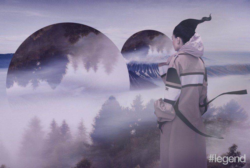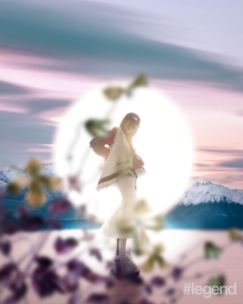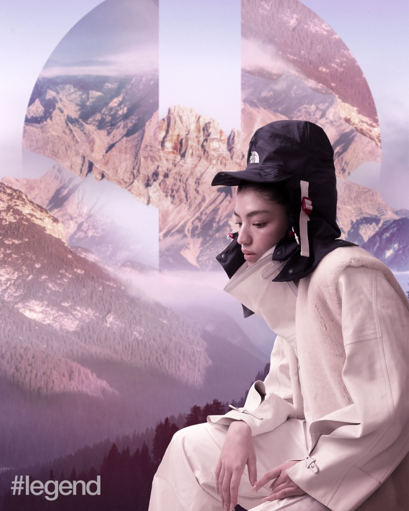 Model in The North Face Kazuki Pink Collection navy hood, Hermès cream leather jacket and trousers and Bally cream shearling gilet Model in Burberry black and white striped hoodie and white lace dress and Fendi black boots