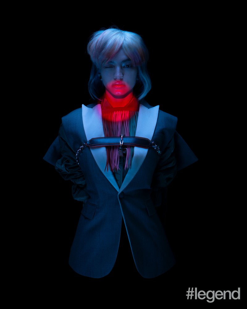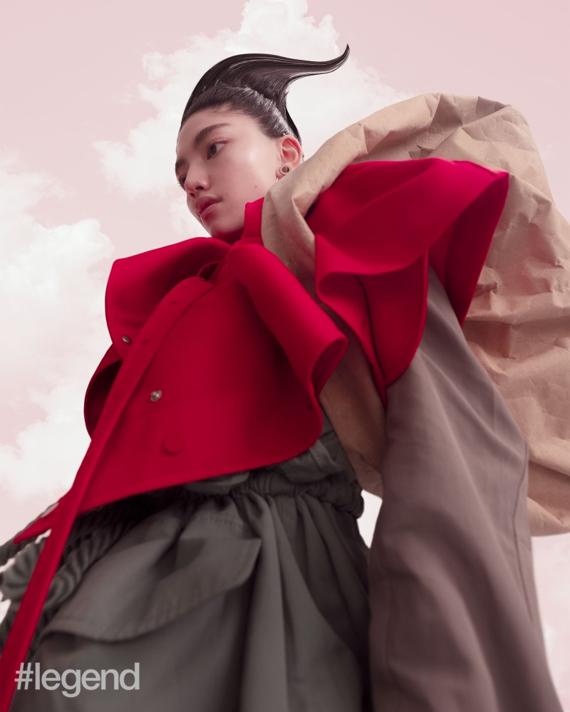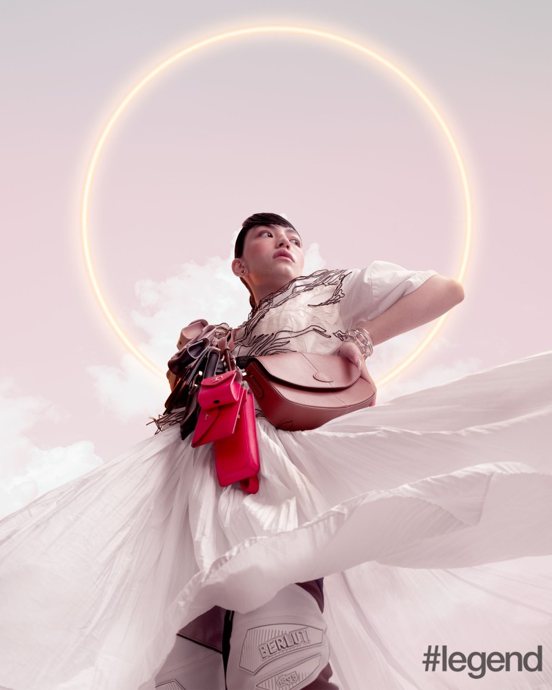 Model in Jil Sander white dress, Berluti white motorcycle trousers, Tod’s satchel and bag accessories and Hermès silver cuff Model in The North Face Kazuki Pink Collection fuchsia and navy hooded windbreaker, Sacai white and black tweed top, trousers, white skirt and black platform sandals, Louis Vuitton red, fuchsia and white Twist and Twisty bags and Fendi rainbow reflective sunglasses