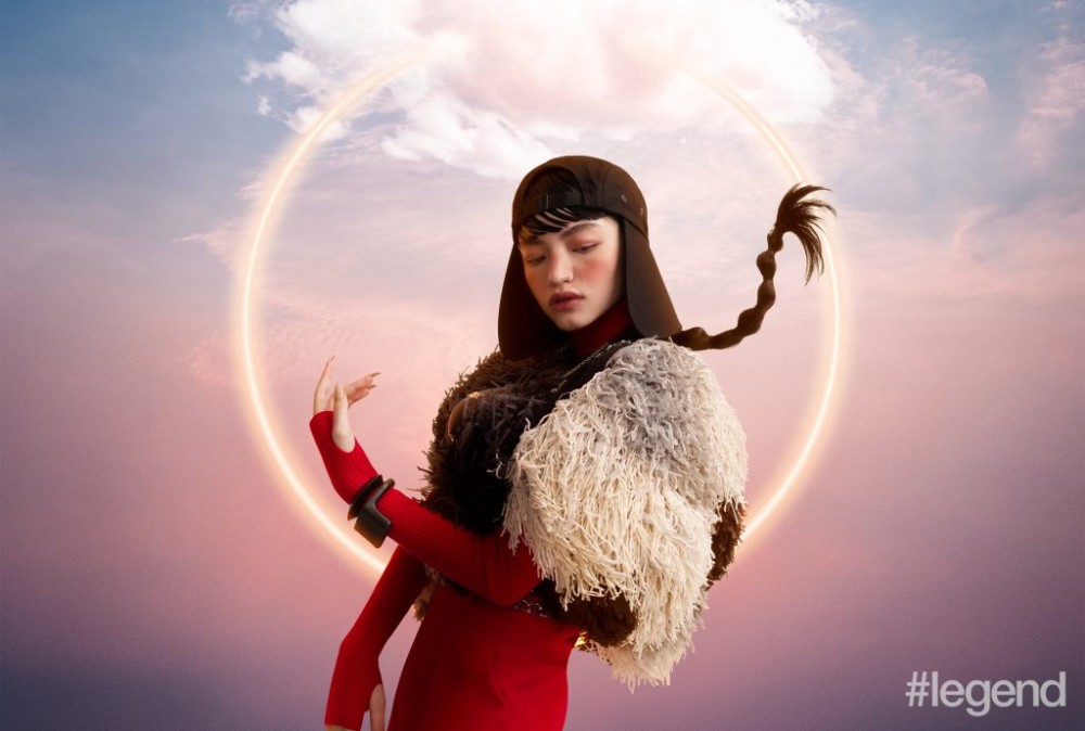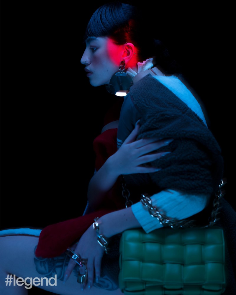 Model in Timberland olive-green fleece jacket, 2 Moncler 1952 white turtleneck top, Bally white shearling coat and red shearling vest, Bottega Veneta green padded Cassette handbag with chain, Burberry oversized sequin earring and Ambush bracelet and rings Model in Longchamp white, yellow and grey suede jumpsuit, 8 Moncler Richard Quinn white leggings, Sportmax silver glitter sock boots, Max Mara black double-tiered belt (worn on leg) and Fendi brown Baguette bag with green strap Model in JW Anderson grey blazer with white lapels, Ganni green quilted jacket available at Lane Crawford, Berluti brown bag strap with chain and Hermès multicoloured Trim Anate bag