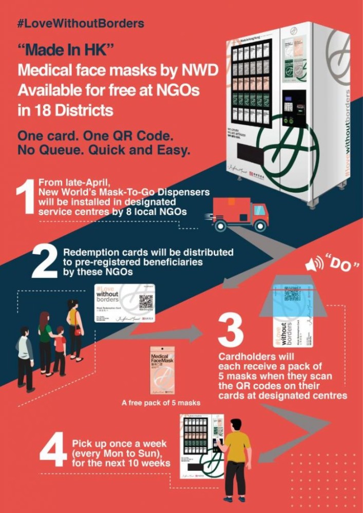 In late February, Cheng, who is also the CEO of New World Development (NWD), announced that NWD has set up local mask production lines through its charity foundation to produce at least 200,000 high quality medical masks a day in Hong Kong. Through a “Mask To Go” distribution programme, 10 million masks will be distributed for free to the public, prioritising 8 NGOs across the city.